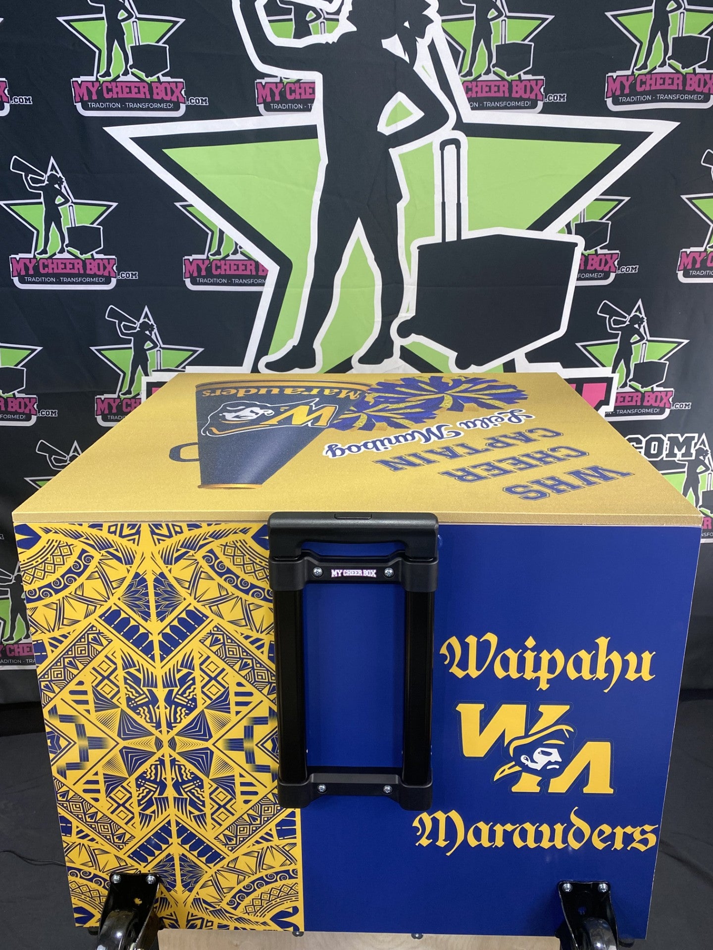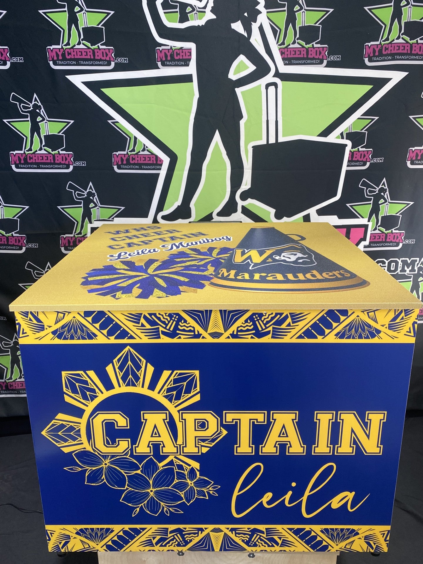 The Showstopper Cheer Box measures 24” H × 30” W × 30” D when open, and folds down to a compact 25” L × 30” W × 4.5” H. Crafted from genuine exterior-grade Baltic Birch, this is our largest and most striking cheer box designed to elevate your team's presence. Its fully collapsible structure ensures easy transport and storage. Available in multiple levels, the base model includes rubber gripper feet, lid hooks with pads, hidden nylon handles, and felt lid runners—ready for your custom decoration. Higher tiers add retractable handles, wheels, and fully customizable vinyl wraps, allowing you to tailor your cheer box for maximum impact.