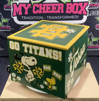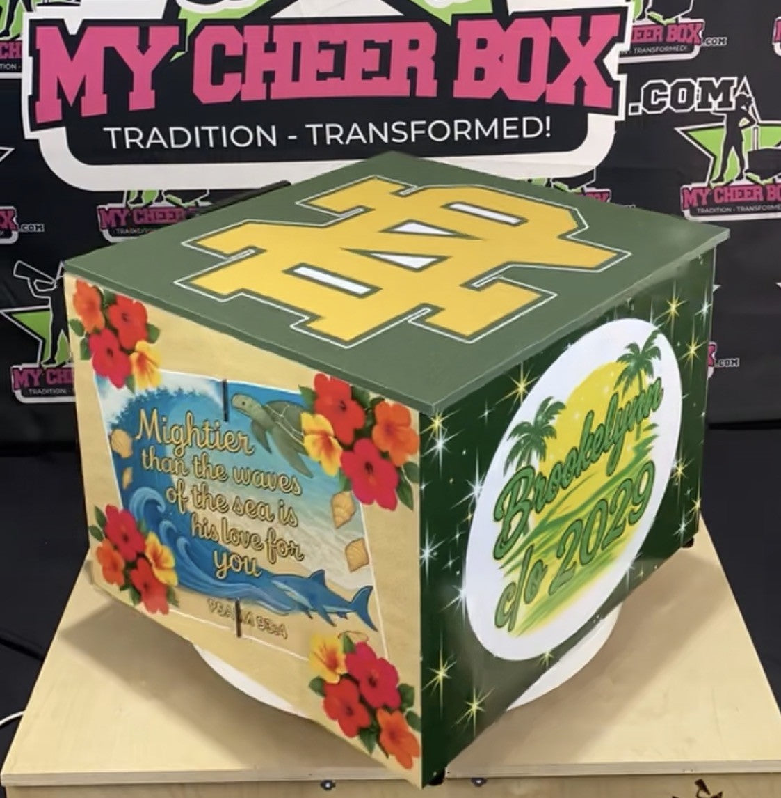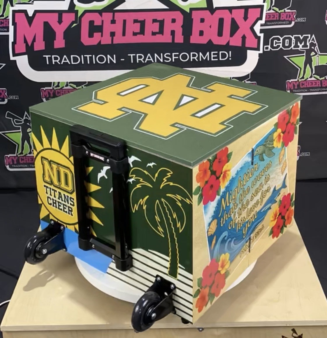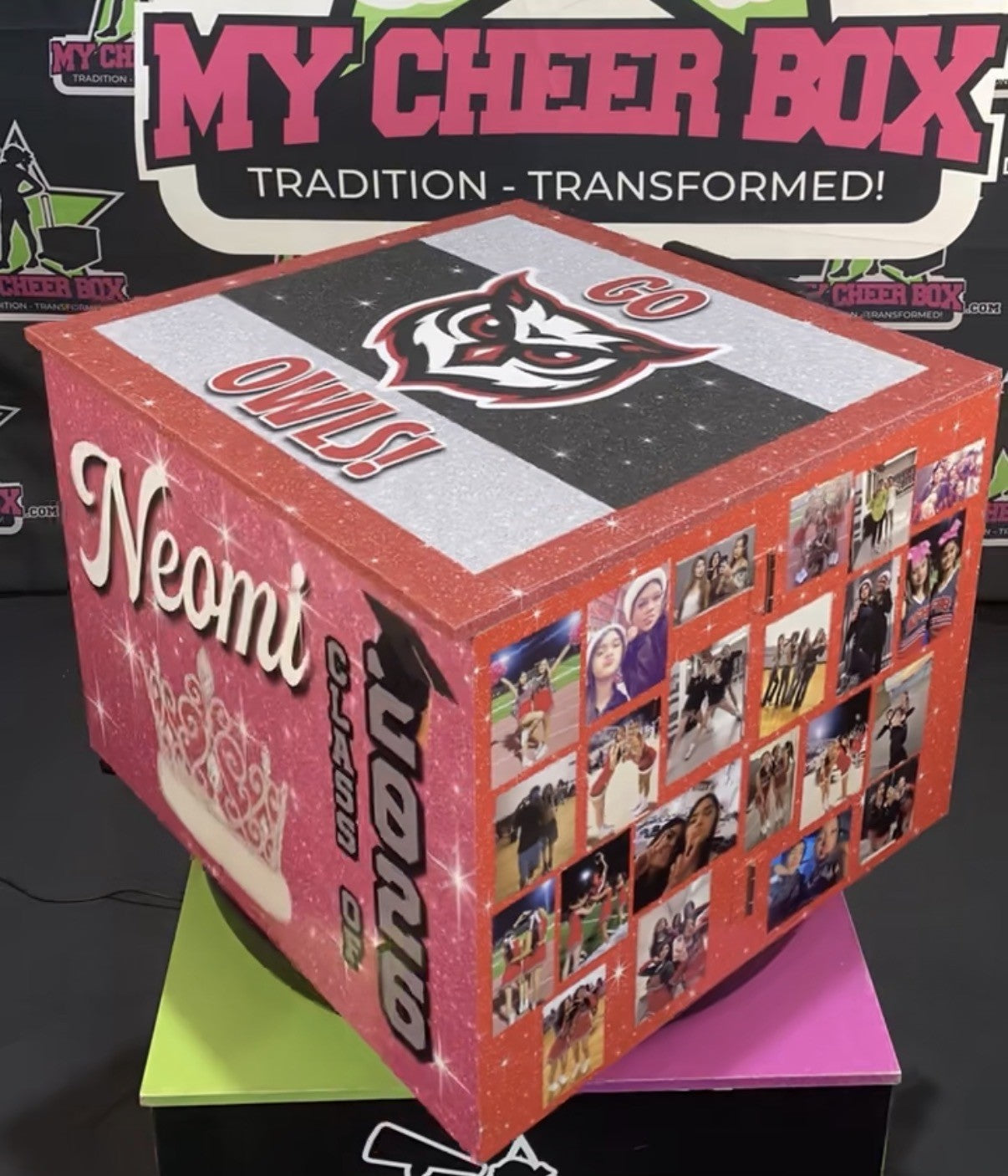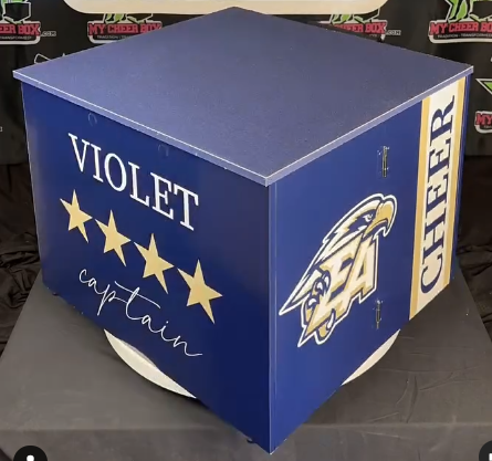 After purchase, your cheer box must be dropped off within 3–5 days for vinyl installation. Production begins once your box is received. Delays in drop-off will delay your order.